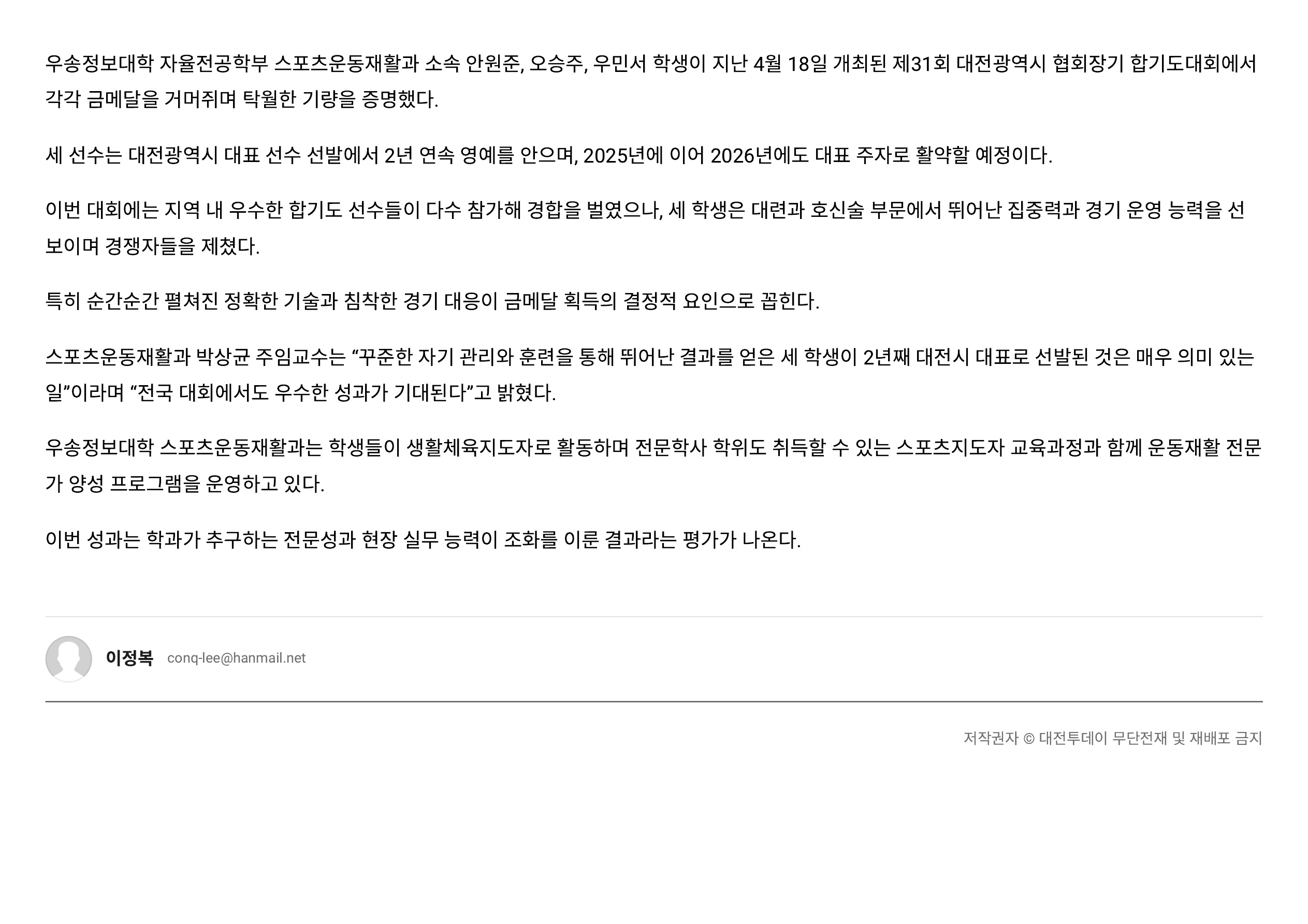 우송정보대학 자율전공학부 스포츠운동재활과 소속 안원준, 오승주, 우민서 학생이 지난 4월 18일 개최된 제31회 대전광역시 협회장기 합기도대회에서 각각 금메달을 거머쥐며 대전광역시 대표 선수 선발에서 2년 연속 영예를 안으며, 2025년에 이어 2026년에도 대표 주자로 활약할 예정입니다.