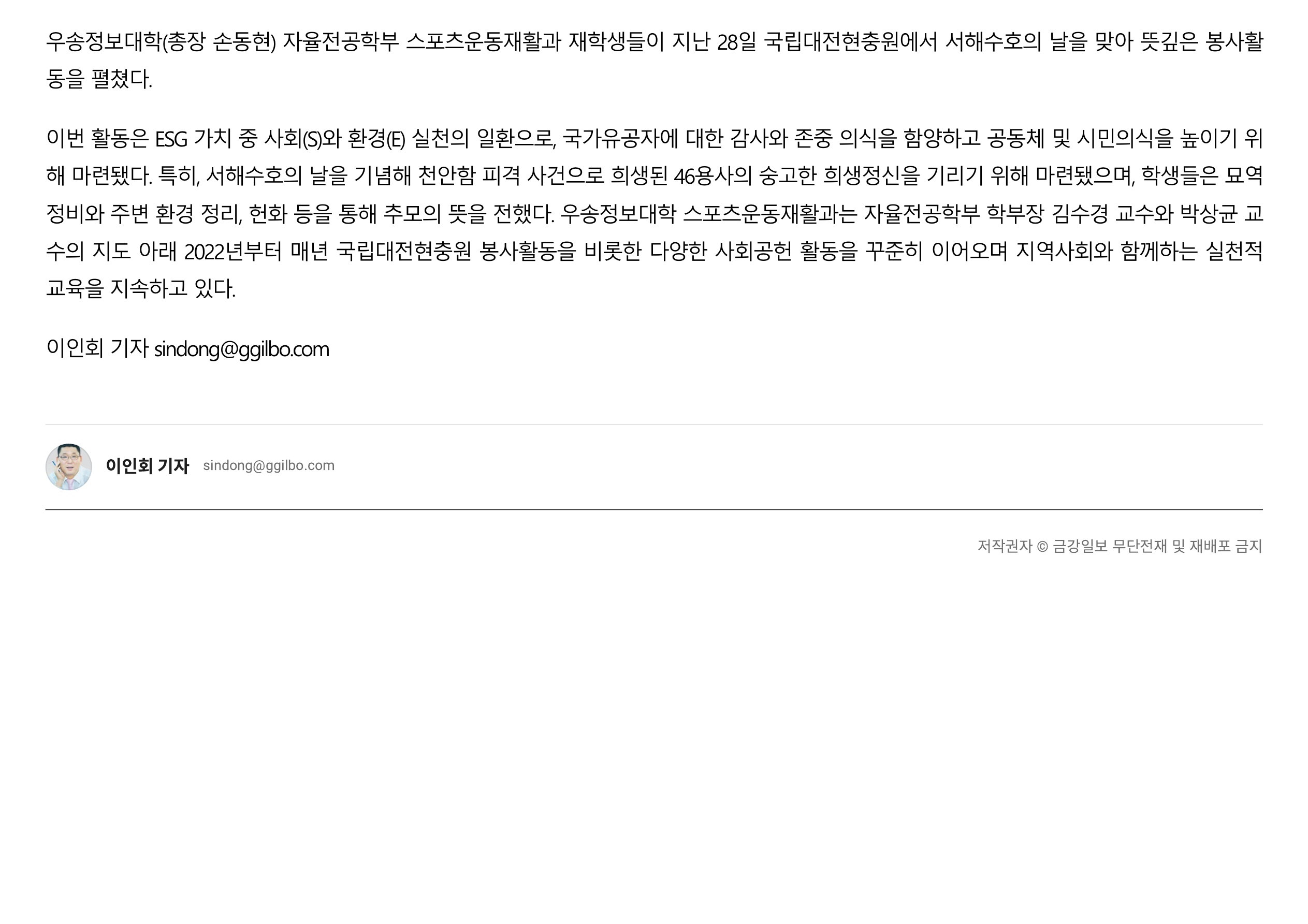 커뮤니티 학부소식 포토갤러리 Home커뮤니티포토갤러리 포토갤러리 [스포츠운동재활과] 서해수호의 날 맞아 현충원서 봉사활동 카테고리 : | 작성자 : 학과관리자 | 작성일 : 2026.04.01 | 조회수 : 2 첨부파일 우송정보대학 스포츠운동재활과, 서해수호의 날 맞아 현충원서 봉사활동_1.jpg [1]우송정보대학 스포츠운동재활과, 서해수호의 날 맞아 현충원서 봉사활동_2.jpg 목록 이전글 이전 글이 없습니다. 다음글 [스포츠운동재활과] 빅토리장학회로부터 장학긍을 기탁받았습니다.